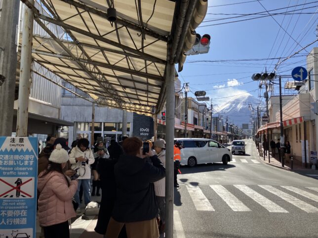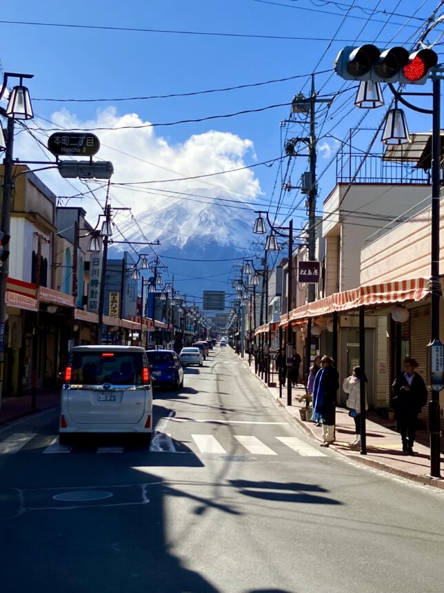 お正月には富士山ということで、SNSでも有名な富士吉田のこの場所、本町通りに行ってきました。少し雲がかかっておりましたが天気にも恵まれ、良い景色を見ることが出来ました。