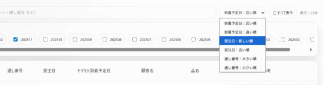 上記のプルダウンメニューにて、納品前商品や、受注品全て等も選択可能ですので、納品済みのデータも見ることも可能です。表示の順番も、オーダー到着日順や、受注日順に表示の変更も出来ます。また、メモ欄も設置しておりますので、特筆したい内容を追記出来る仕様となっております。