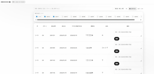 各お客様毎にURLがありますので、アクセス頂くだけで、現在のご注文頂いてる全てのオーダーサービスのリストが表示されます。弊社の受注日と、ヤマモトへのオーダー商品納品日、お客様名が表示されておりますので、受注管理としてご活用頂けますので是非ご活用頂きたいです。
